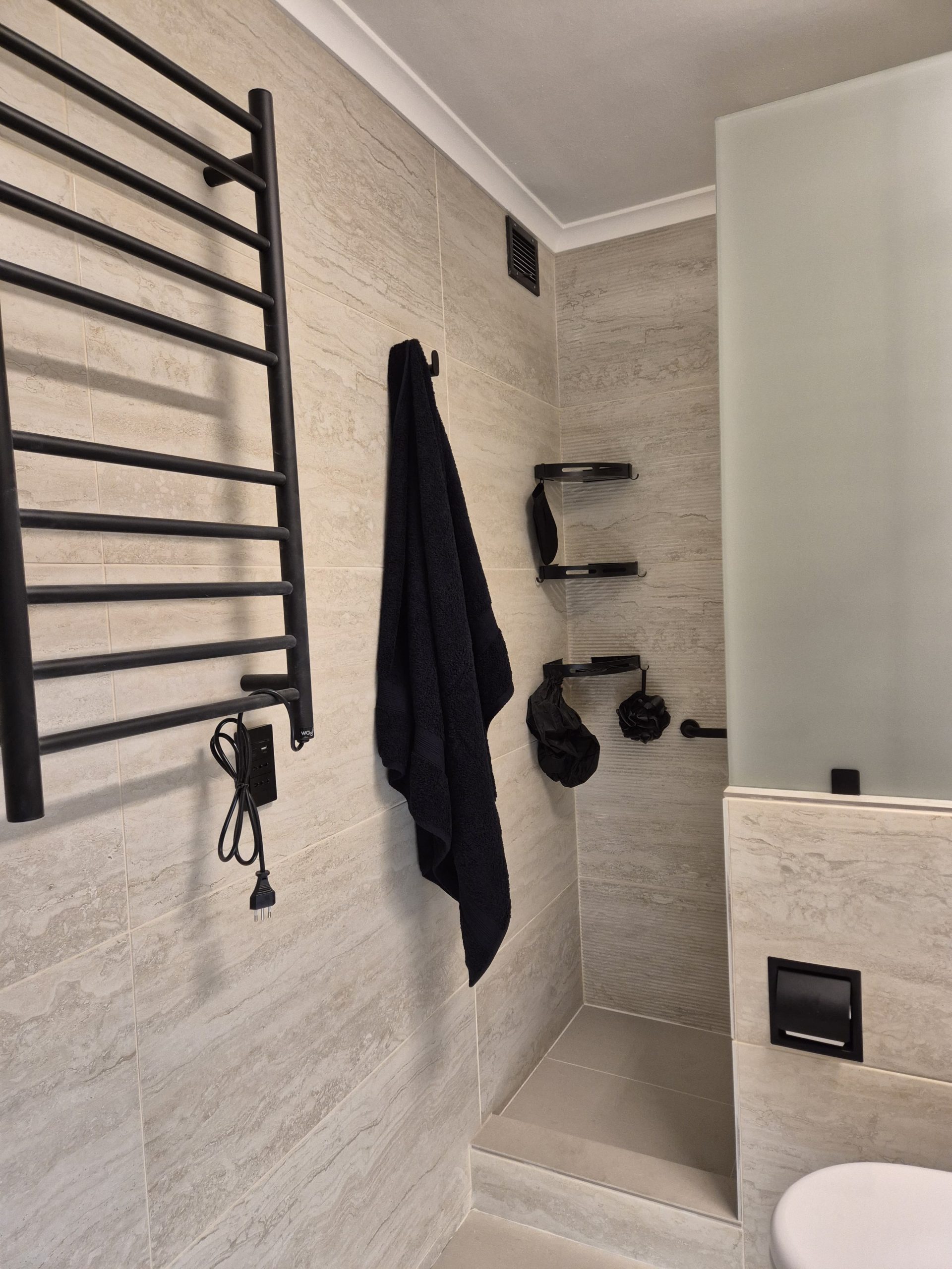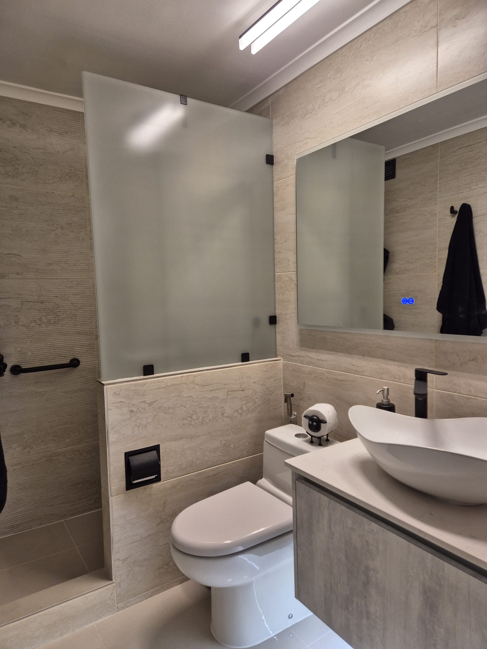 Amoblado de baño, puertas postformadas rectas y cubiertas de cuarzo carrara